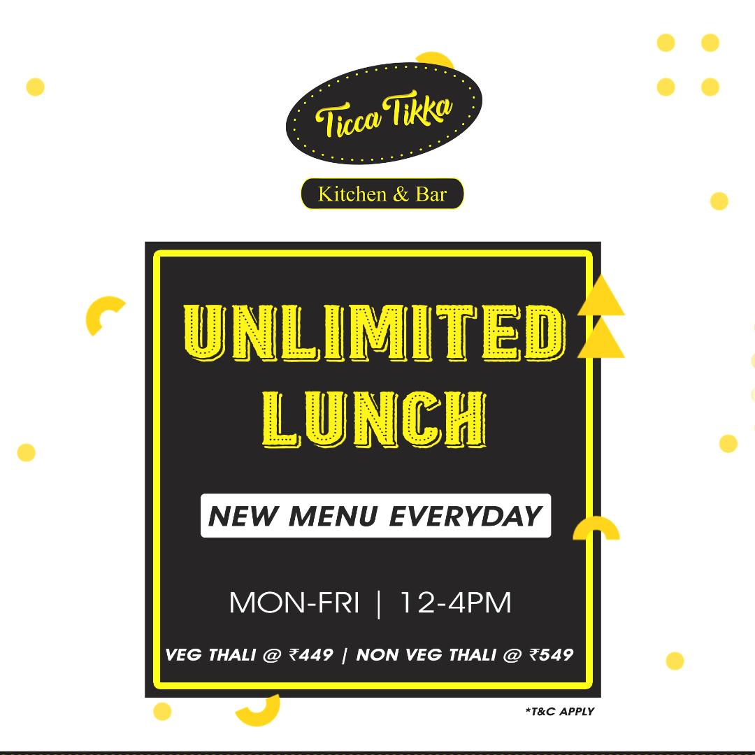 Mid month budget crisis? Strapped for cash but still have a massive appetite? Then Ticca Tikka is the place for you. Join us at Ticca Tikka for a lunch treat that will leave your stomach filled and wallets too! Enjoy Unlimited Lunch Thali for INR 449(veg) & 549(non veg) with delicious new menu everyday from Monday to Friday, 12 noon till 4 pm at Ticca Tikka!