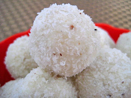 - Roll each laddoo in the remaining grated coconut till it is evenly coated.
